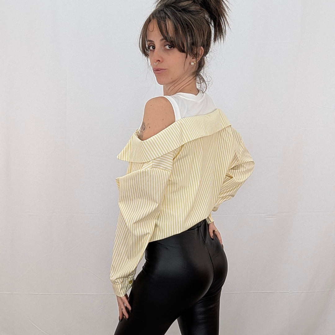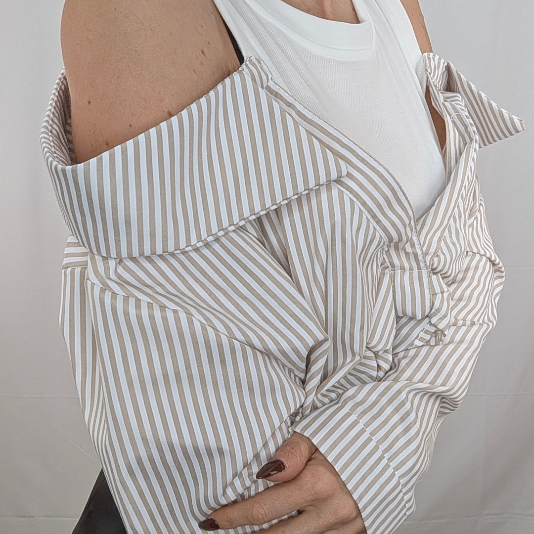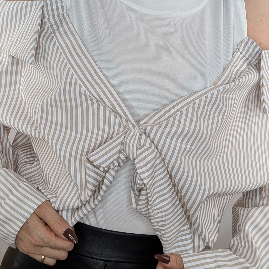 Una reinvención magistral de la camisa de rayas clásica. Esta prenda de efecto «dos en uno» te soluciona el look al instante con un juego de superposiciones impecable. Simula llevar una camiseta básica blanca debajo de una camisa de popelín a rayas estratégicamente descolocada. Destaca por su escote de hombros caídos que deja las clavículas al descubierto y un favorecedor nudo frontal que ciñe y frunce la tela en la cintura. Es fresca, original y aporta ese aire de effortless chic (arreglada pero informal) sin complicaciones. Disponible en rayas Rosa (foto), Azul, Beige y Amarillo.