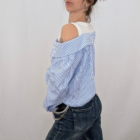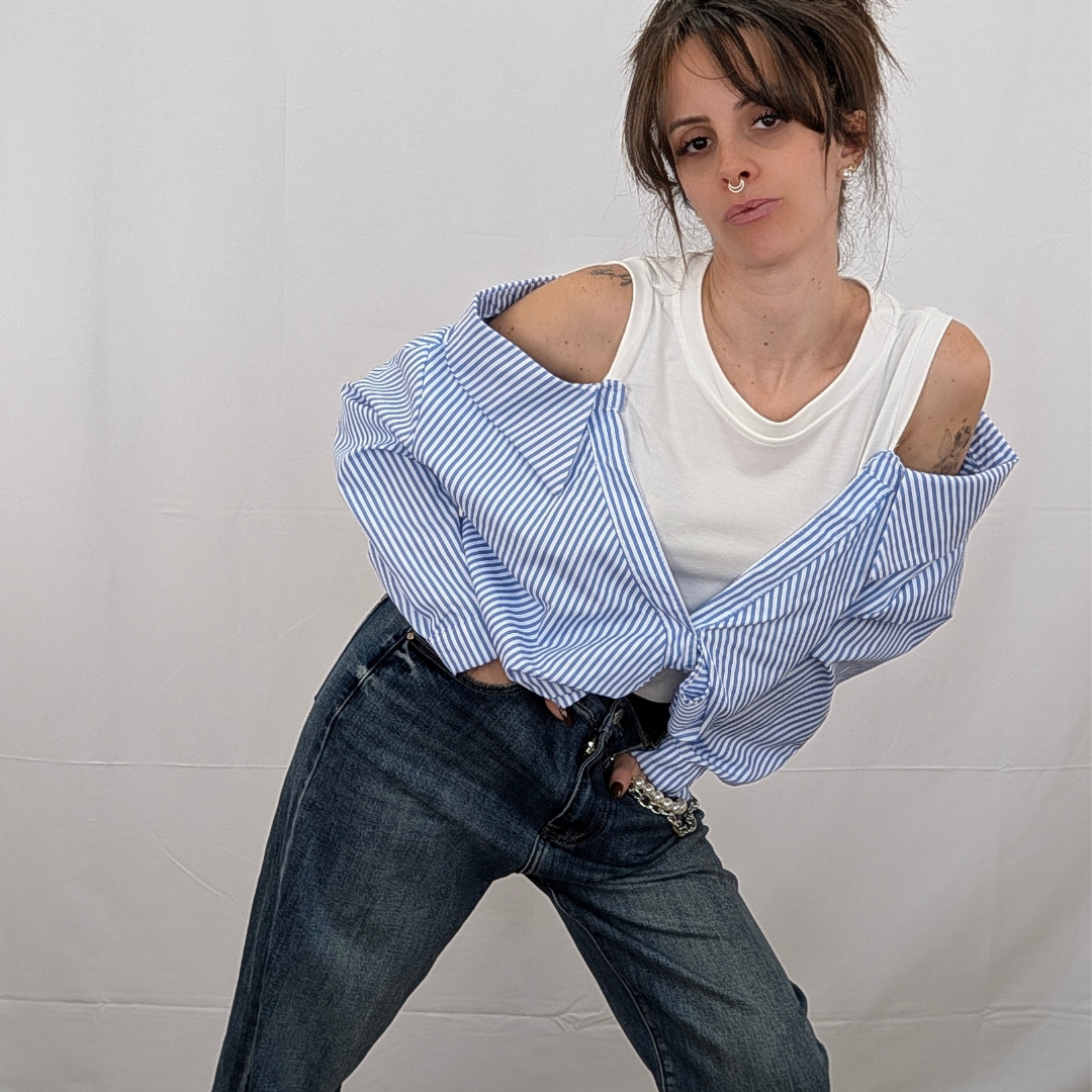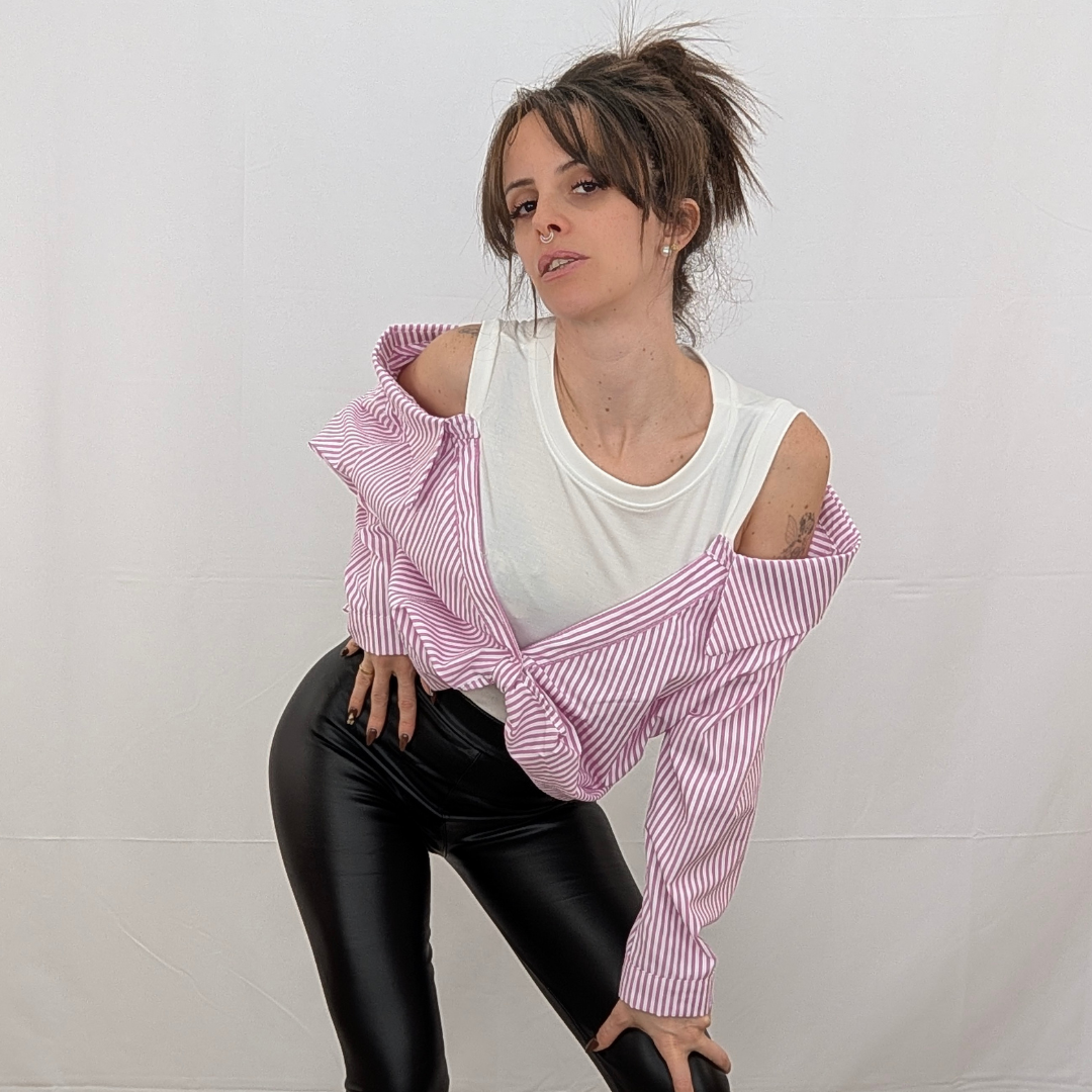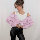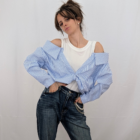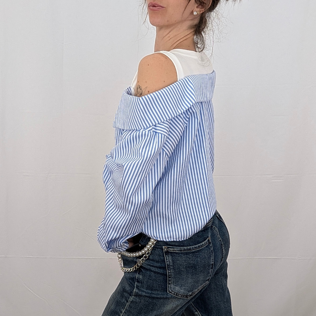 Una reinvención magistral de la camisa de rayas clásica. Esta prenda de efecto «dos en uno» te soluciona el look al instante con un juego de superposiciones impecable. Simula llevar una camiseta básica blanca debajo de una camisa de popelín a rayas estratégicamente descolocada. Destaca por su escote de hombros caídos que deja las clavículas al descubierto y un favorecedor nudo frontal que ciñe y frunce la tela en la cintura. Es fresca, original y aporta ese aire de effortless chic (arreglada pero informal) sin complicaciones. Disponible en rayas Rosa (foto), Azul, Beige y Amarillo.