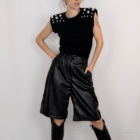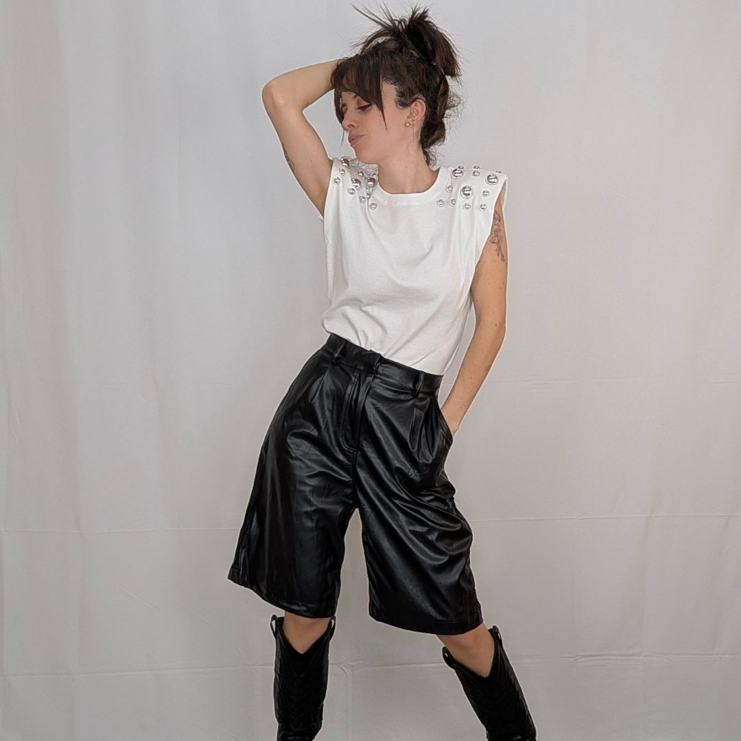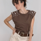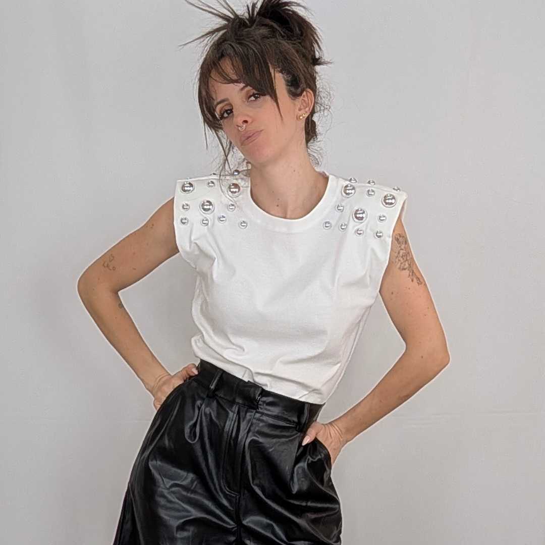 La reinterpretación de la camiseta básica para darle una actitud poderosa. Esta prenda sin mangas estilo muscle tee destaca por su estructura en los hombros, potenciada por un detalle espectacular: esferas metálicas (tachuelas 3D) aplicadas de forma asimétrica en la zona superior. Aporta un toque glam-rock instantáneo que eleva cualquier look de diario. Su cuello redondo clásico y su corte recto aseguran comodidad total sin perder estilo. Disponible en tres tonos clave: Marrón, Blanco y Negro.