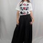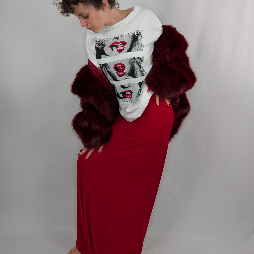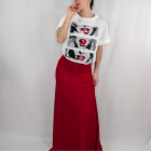 Atrévete a provocar con esta camiseta blanca de algodón que rinde homenaje a la sensualidad y el estilo pop art. Su diseño frontal presenta un tríptico gráfico en blanco y negro de labios icónicos, resaltados con potentes toques de rojo vibrante y el detalle de una cereza que atrapa la mirada. De corte relajado y manga corta, es la camiseta estampada de mujer perfecta para inyectar actitud a tus vaqueros o crear un contraste rompedor con faldas largas de fiesta. Una prenda con personalidad propia que transforma lo básico en extraordinario.