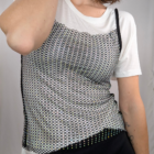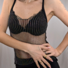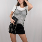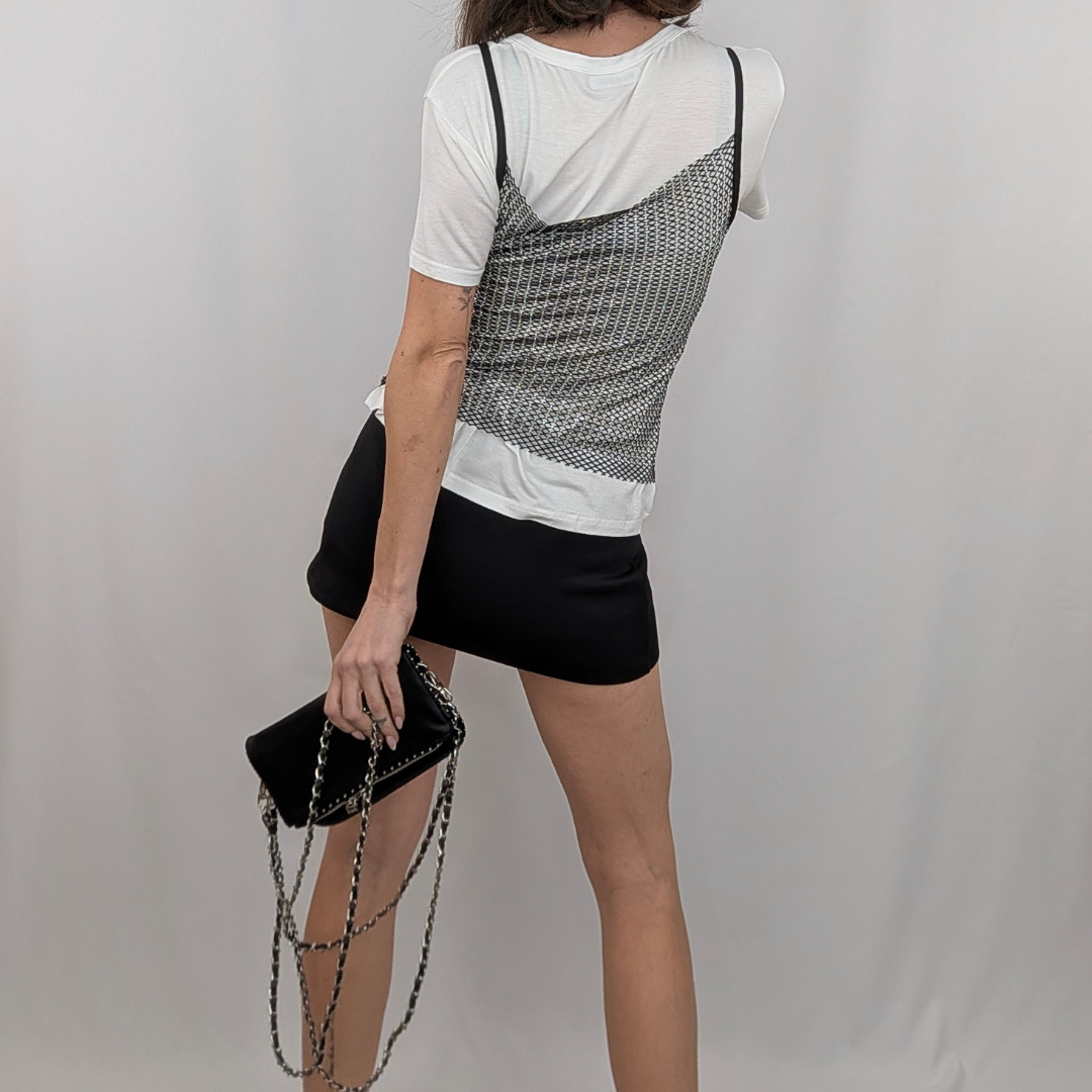 Domina el arte del layering (superposición) con este top de estilo lencero en red joya. A diferencia del chaleco, este diseño presenta tirantes finos negros (spaghetti straps) y un escote redondeado ribeteado en negro, lo que le da un aire más noventero y delicado. La malla plateada con incrustaciones de brillo está pensada para llevarse sobre otras prendas: transforma instantáneamente una camiseta blanca básica, un vestido ajustado o un jersey fino de cuello alto en un look de tendencia. Es el accesorio que funciona como ropa.
