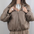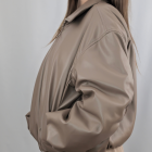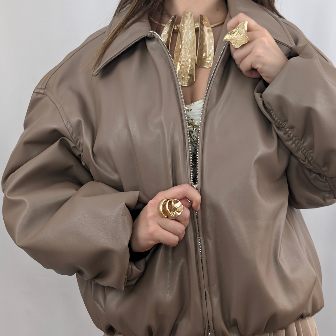 Domina el asfalto con esta chaqueta bomber oversize en un versátil color taupe (topo). Confeccionada en tejido efecto piel de tacto suave, esta pieza reinventa la clásica cazadora de aviador añadiendo detalles de diseño únicos: unas espectaculares mangas fruncidas que aportan textura y un volumen arquitectónico inigualable. Su cierre de cremallera frontal y los acabados elásticos en puños y bajo garantizan ese ajuste abullonado tan buscado. Es la cazadora de mujer definitiva para quienes buscan elevar un look casual con un toque de sofisticación urbana y vanguardista.