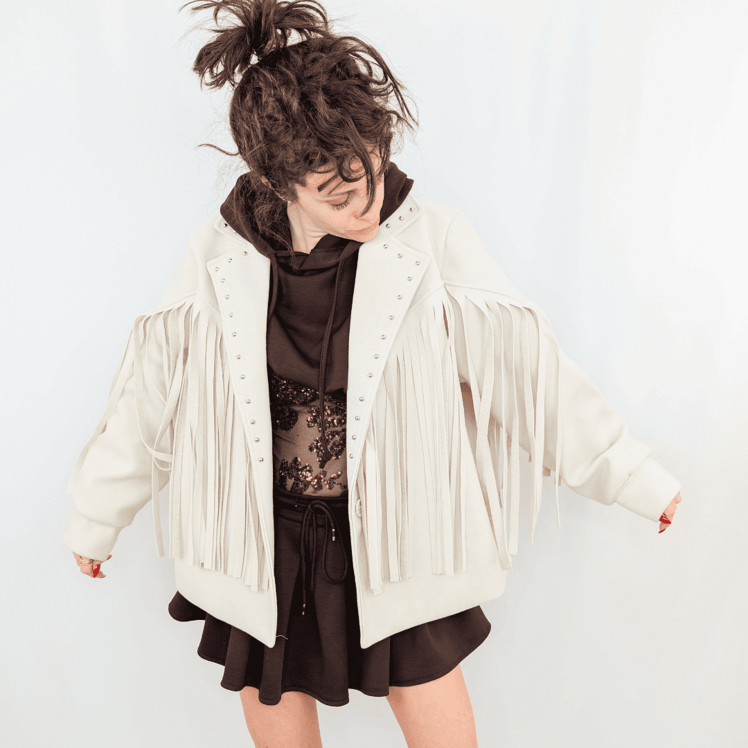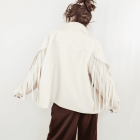 Súmate a la tendencia cowboy más chic con esta chaqueta de corte estructurado y tono crema/beige claro, que captura la esencia del estilo western renovado con su cascada de flecos en pechera, espalda y mangas. Con un toque rockero aportado por las pequeñas tachuelas plateadas que recorren las solapas.