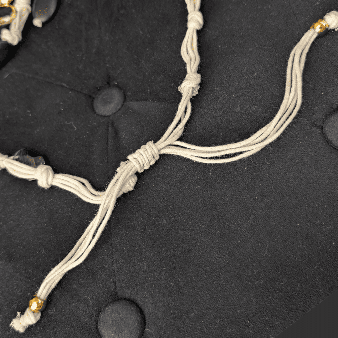 La versatilidad hecha accesorio. Este collar se aleja de la rigidez para ofrecer una adaptación total gracias a su base de cuerda resistente con nudo corredizo. Este sistema te permite modificar el largo a tu antojo: úsalo pegado al cuello como gargantilla o déjalo caer largo para estilizar. El diseño se completa con una cuidada selección de piedras y elementos decorativos que cuelgan, aportando textura, color y ese aire artesanal y bohemio que eleva cualquier look casual.