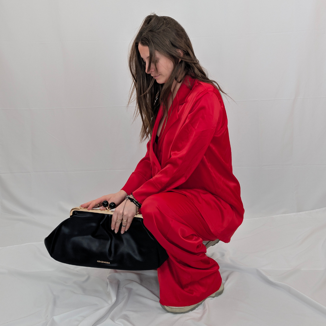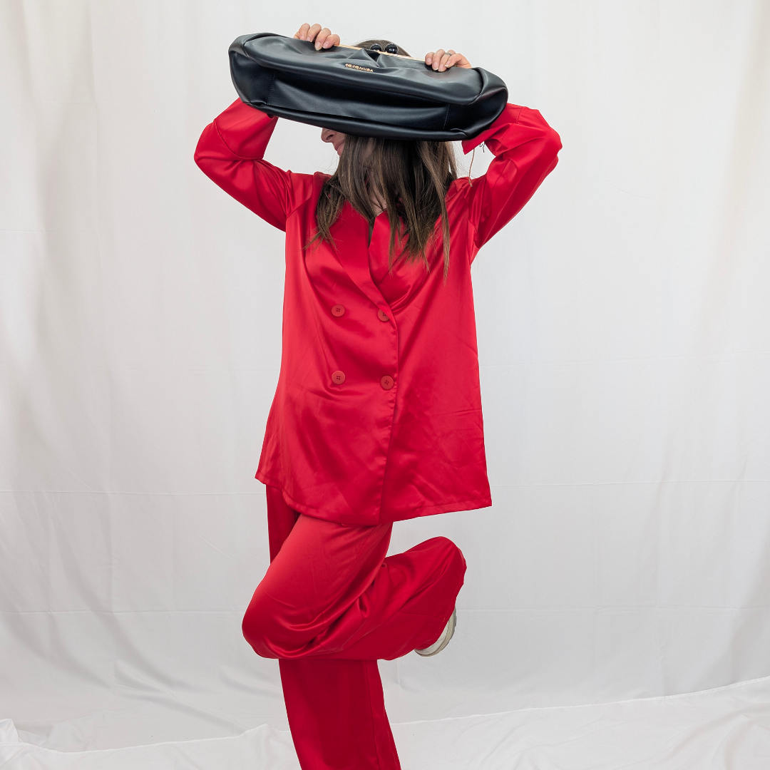 Redefine el Power Dressing con este impresionante traje de dos piezas en tejido satinado. El conjunto irradia lujo y fluidez gracias a su acabado brillante efecto seda. Se compone de una blazer de corte cruzado (doble botonadura) con solapas clásicas y un pantalón de pierna ancha (wide leg) que alarga la silueta con cada paso. Disponible en dos colores de alto impacto: un Rojo Vibrante para las que no temen destacar y un Negro Clásico para una elegancia nocturna y misteriosa. Es la opción perfecta para eventos formales, cenas navideñas o para llevar por separado y elevar tus looks de diario.