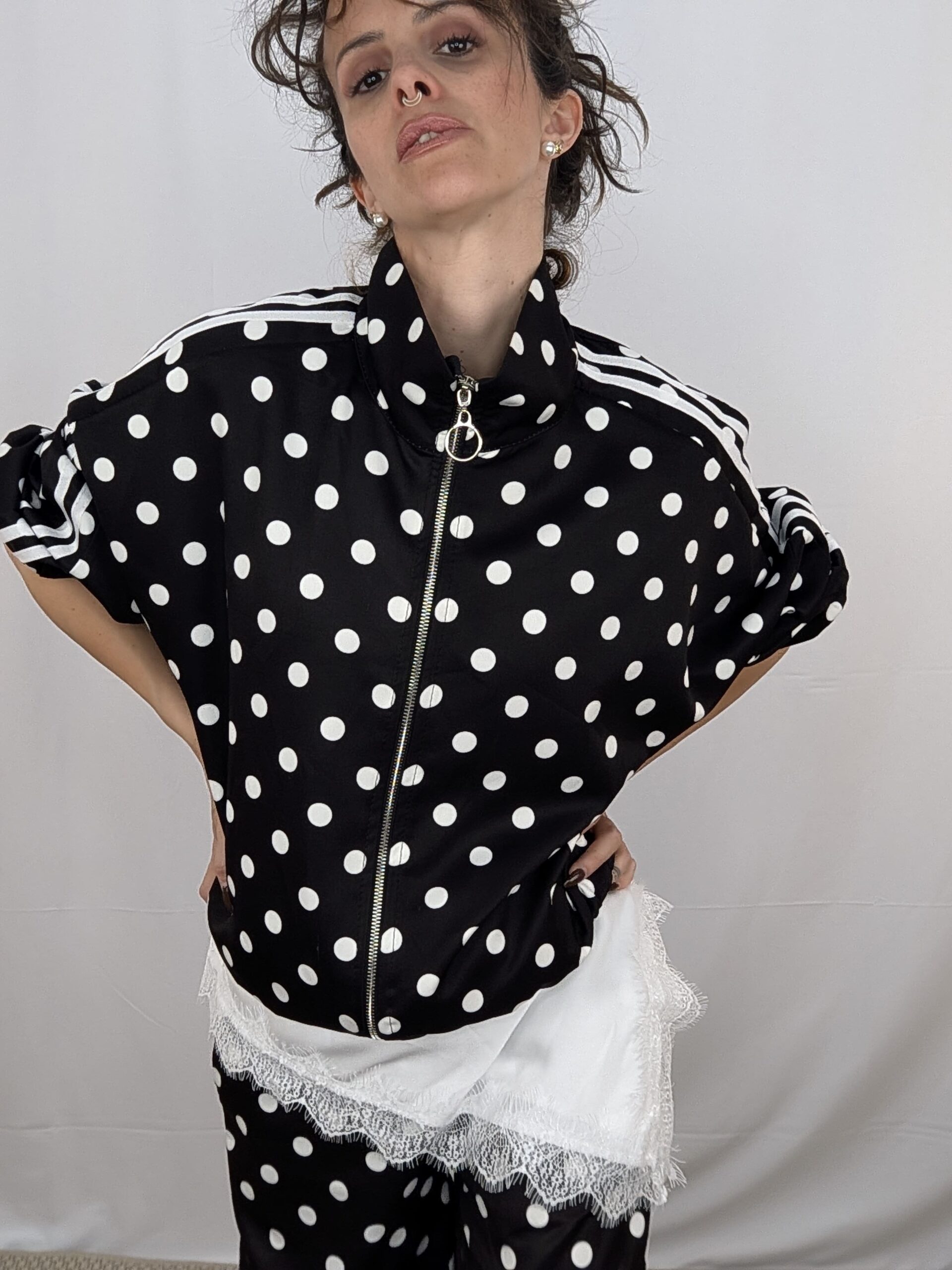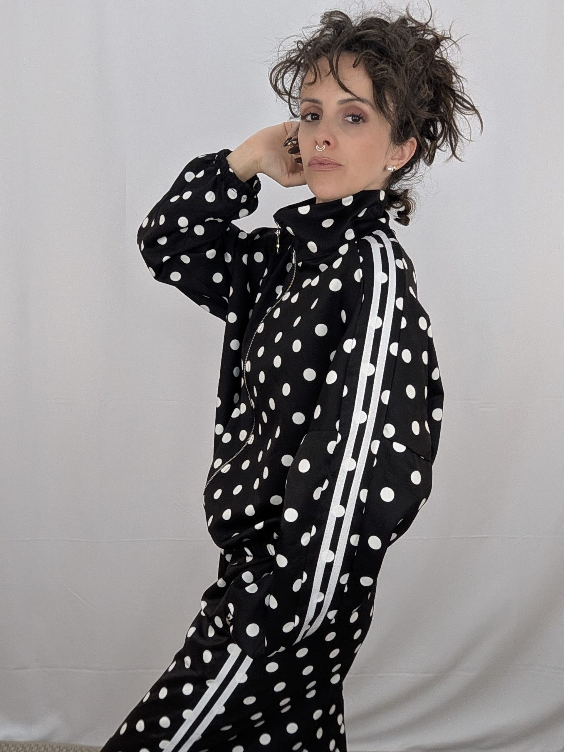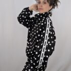 Un dos piezas que reinventa el estilo casual urbano con un toque divertido y atemporal. Este conjunto de inspiración deportiva presenta una base en color negro profundo salpicada por un vibrante y clásico estampado de lunares blancos, aportando un aire retro muy chic a la prenda. Consta de una parte superior de corte relajado que prioriza el confort, junto con un pantalón a juego diseñado con cintura elástica y una silueta fluida que garantiza total libertad de movimiento. Es la fusión definitiva entre la máxima comodidad de la tendencia athleisure y un patrón gráfico que nunca pasa de moda, perfecto para looks relajados y con mucha personalidad.