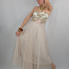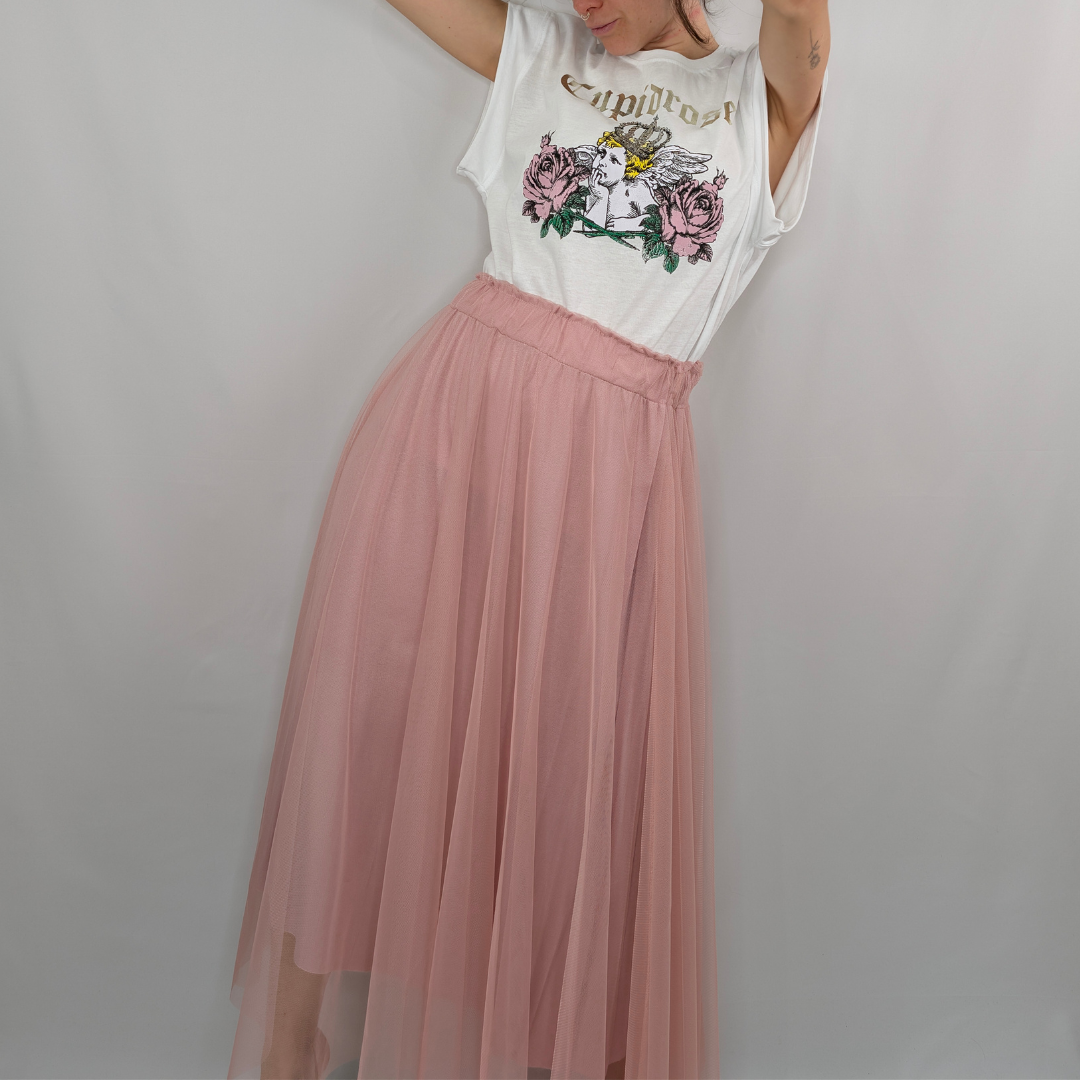 Falda midi con capa de tul y forro. Cintura elástica fruncida.